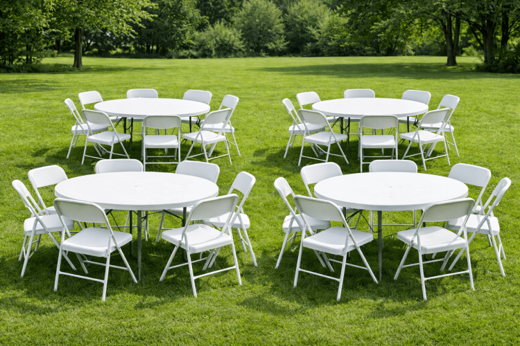 Includes: (4) 4ft Round Tables + (24) White Folding Chairs